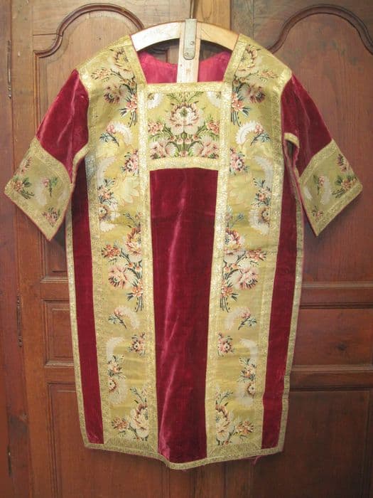 Dalmatique, d'un ensemble de 4, fond velours cramoisi, parements lampas à motif de fleurs au naturel, grappes de raisins et épis de blé sur fond or, galon or.