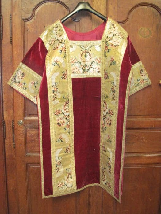Dalmatique, d'un ensemble de 4, fond velours cramoisi, parements lampas à motif de fleurs au naturel, grappes de raisins et épis de blé sur fond or, galon or.