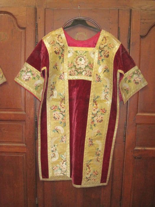 Dalmatique, d'un ensemble de 4, fond velours cramoisi, parements lampas à motif de fleurs au naturel, grappes de raisins et épis de blé sur fond or, galon or.