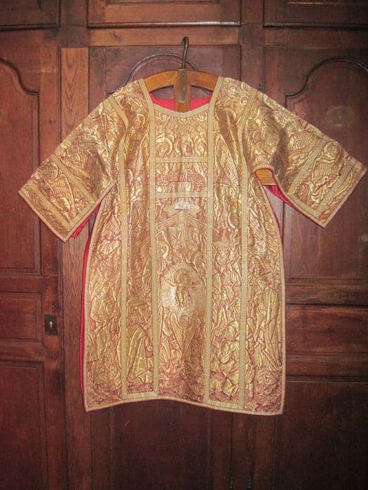 Dalmatique entièrement brochée de fils d'argent doré. Sur l'avers : le Christ en gloire ; sur le revers : la Nativité.