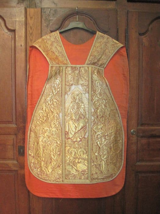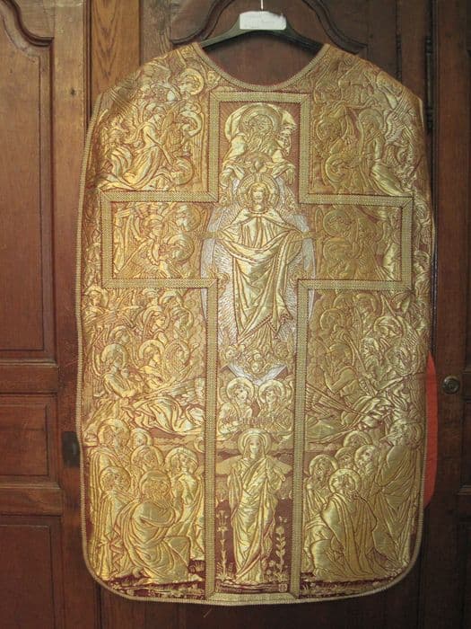 Chasuble entièrement brochée de fils d'argent doré. Elle est ornée sur le dos d'une croix où est le Christ dans une mandorle, au-dessus de la Vierge, entourés des apôtres priant et du choeur céleste, et sur le devant de la Vierge à l'Enfant en majesté entourée du choeur céleste.