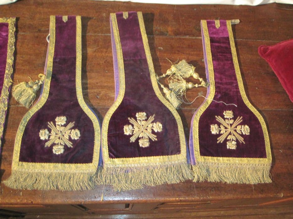 3 manipules fond velours violet, ornements floraux guipure fils métalliques or, galon or, franges or.