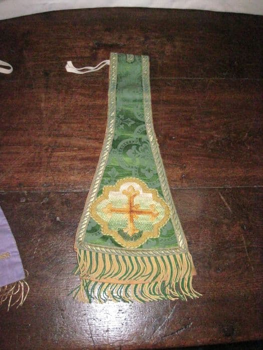 Manipule fond damas vert, croix brodée or dans un quadrilobe, franges vert et or, galon argent