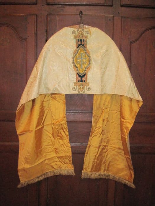 Echarpe fond damassé soie crème à motifs de coeurs fleuronnés, les parements sont en broderie guipure polychrome (rose, vert, or etc), à motifs de fleurs de lys. Au centre, le chrisme dans une mandorle.