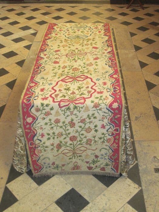 Voile huméral broderie au petit point à motifs de bouquets de roses au naturel et de pampres de vignes sur fond crème, et ponctué de rubans