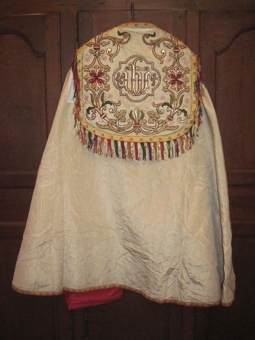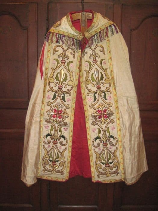 Chape fond moiré crème, ornements broderies guipure rouge et or.