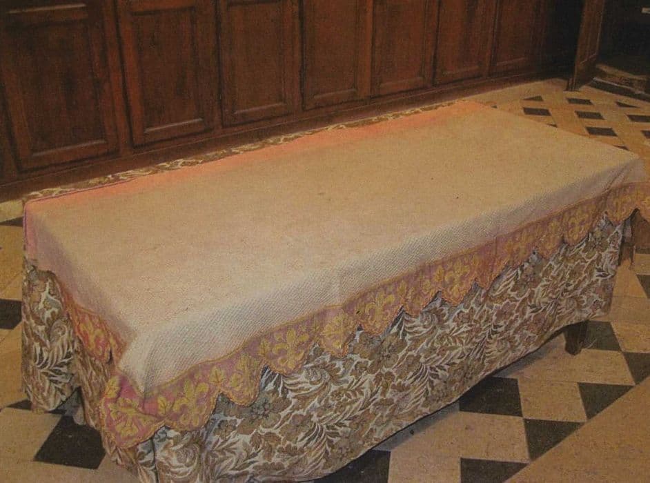 Antependium au crochet de laine, avec bordure au petit point en forme de lambrequins alternant croix et fleurs de lys.