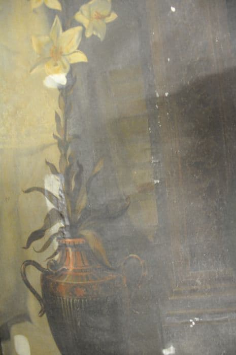 Toile tendue sur châssis. Tableau de format oblong, arrondi dans sa partie supérieure.