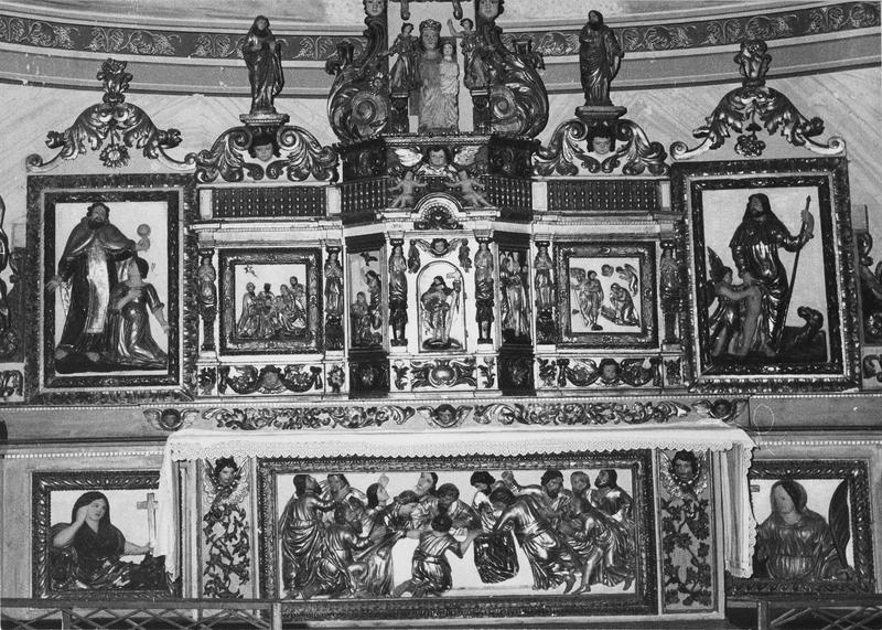 POP | Plateforme ouverte du patrimoineautel, tabernacle, retable (maître-autel) : Scènes de la vie de la Vierge, Guérison d'Agathe (la), saint Roch, assomption de la Vierge (l'), sainte Madeleine, sainte Marguerite