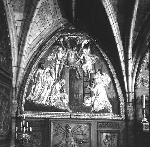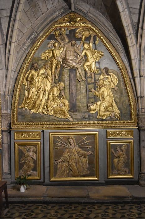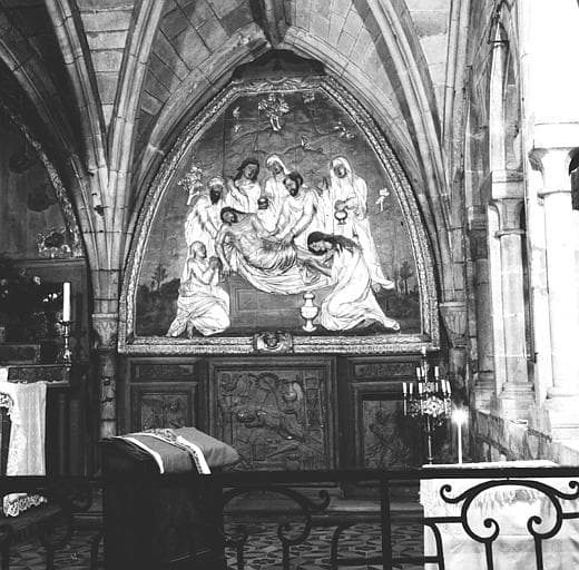 retable : Piéta, la Descente de Croix, Vierge des sept douleurs entre deux anges (la), la Mise au tombeau, Enfant Jésus sur la croix au milieu des instruments de la passion (l')