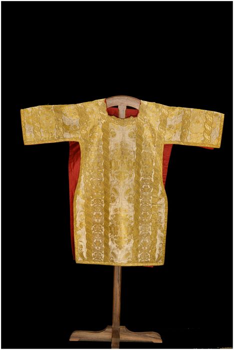 Chape : h = 141 ; l = 286. Chasuble : h = 119 ; l = 67. Dalmatique : h = 108 ; l = 120. Manipule : h = 52 ; l = 23,5. Bourse de corporal : h = 28,5 ; l = 22,5. Pale : h = 20 ; l = 20.