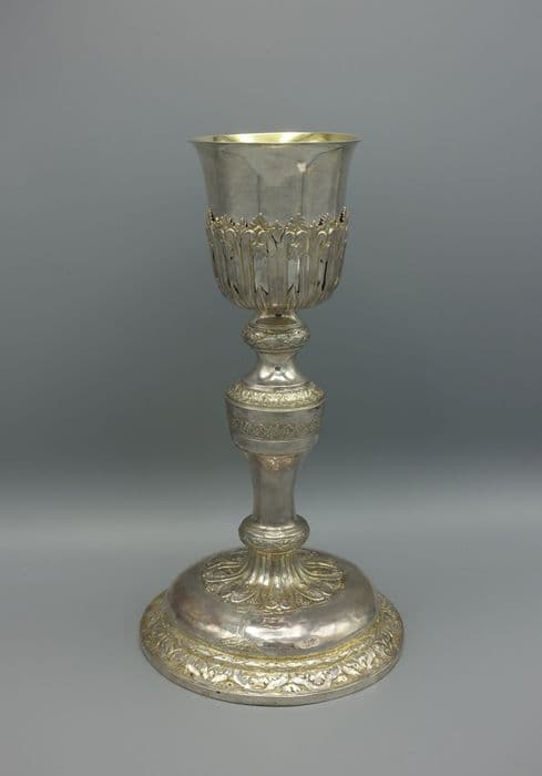 Au-dessus d'un bord droit, le cavet du pied est occupé par une frise de feuillages insérés dans des cartouches trilobés ; un tore de laurier enrubanné le surmonte et ceint le dessus du pied dont le centre porte un décor rayonnant sur fond amati de volutes affrontées ornées en pointe d'une coquille déchiquetée, alternant avec une chute de culot de fruits en graines ; la zone laissée unie est seulement gravée d'une croix dressée sur un tertre. Le noeud balustre présente un épaulement au profil droit orné d'un bandeau ciselé de pampres ; une frise feuillagée court sur le sommet du noeud entouré de deux collerettes à tore de laurier enrubanné. Au décor du dessus du pied répond celui de la fausse coupe au culot feuillagé d'où s'élèvent des volutes affrontées repercées avec des coquilles en chef, le tout couronné d'une petite frise de feuillages découpés festonnant.