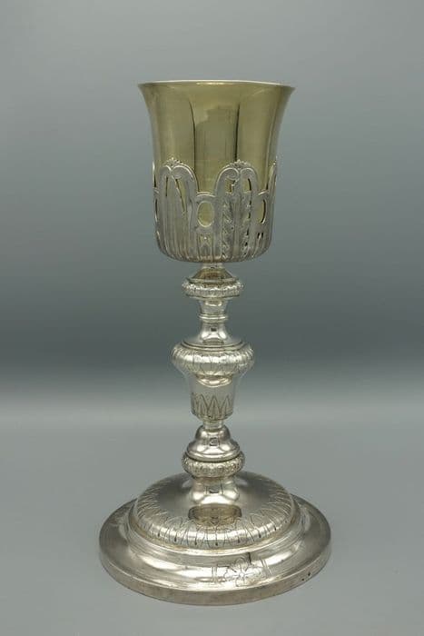Calice muni d'un pied circulaire à bord droit et cavet ciselé de compartiments unis alternant avec des quatre-feuilles. Le dessus du pied est ceint d’une frise de rais de cœur, motifs repris sur le culot et l’épaulement du nœud en forme de vase balustre. Les deux collerettes sont ciselées d’une frise d’oves et entrelacs. La fausse coupe, au bord festonné, porte un décor repoussé-ciselé et repercé à lambrequins chargés soit d’une feuille lancéolée soit d’une feuille d’acanthe.