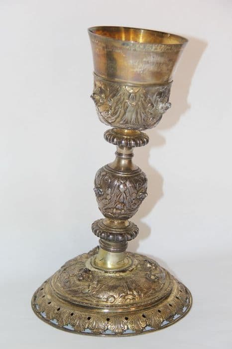 Une frise d’acanthe repercée, soudée à une bâte, borde le pied. Elle est surplombée par une fine collerette à oves et dards. Sur le dessus du pied et la fausse coupe trois têtes de chérubins ailées, traitées en haut-relief, alternent avec des emblèmes de la Passion sur un fond amati : la croix, une échelle et une colonne, un faisceau de joncs et un fouet à lanières sur le pied ; des dés, une tunique et trois clous sur la fausse coupe. Les têtes de chérubin se retrouvent aussi sur le noeud mais elles alternent ici avec des chutes de feuillage. Les deux collerettes de la tige, épaisses, s'ornent d'un rang de perles et pirouettes. La coupe est unie et se visse sur la tige qui est solidaire du pied.