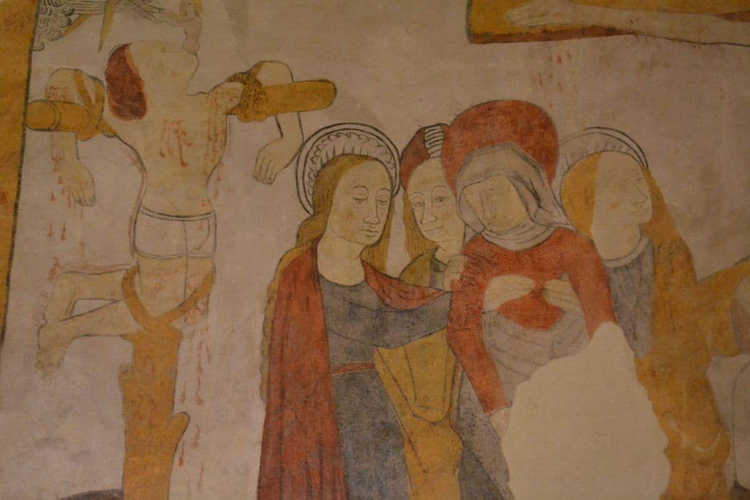 Trois fragments de fresques représentant des scènes du jugement dernier et de l'enfer.