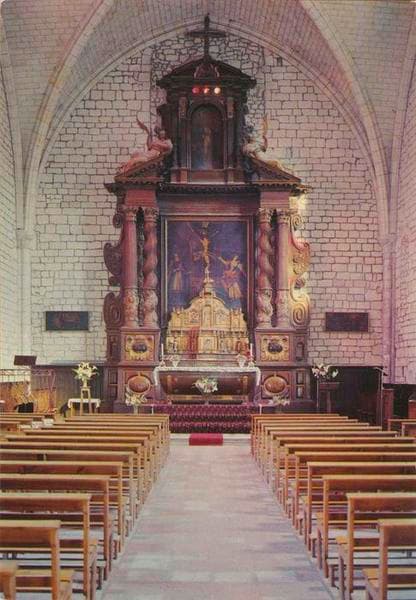 L'autel est en forme de tombeau surmonté d'un petit retable orné de colonnettes torses, de statuettes et de panneaux représentant l'Annonciation. Le tabernacle forme un avant-corps. Sur la porte, représentation du Bon pasteur. Le grand retable se trouve placé derrière et contre l'autel qui dissimule une partie du tableau. Deux colonnes torses et deux colonnes cannelées, sculptées jusqu'au tiers de leur hauteur, soutiennent l'entablement. La base est décorée de petites peintures : la Visitation, la Fuite en Egypte, le Martyre de saint Etienne et de sainte Foy. Le tableau central représente le Christ en croix entre saint Caprais à gauche et sainte Foy à droite. L'entablement est couronné par un fronton brisé qui porte, couchés à droite et à gauche, une figure de saint non identifié, porteur d'une croix.