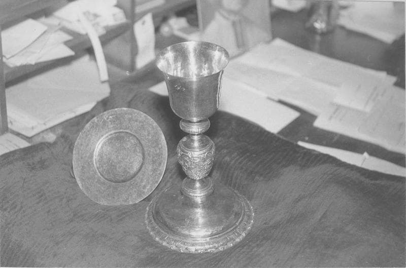 Coupe sans décor. La tige est munie d'un noeud orné de têtes d'anges. Le pied est circulaire, bordé d'une ornementation gravée. Les parties gravées ou repoussées sont dorées.
