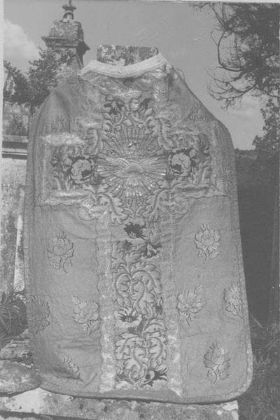 Chasuble rouge, doublée également de rouge. Croix centrale ornée de feuilles d'acanthe, de roses et de gloxinies. Au centre, le Saint-Esprit en fils d'argent sous forme de colombe. La croix est bordée d'une tresse en fils d'or. L'ornementation centrale, feuilles et fleurs, est verte, rose et blanche. Le reste de la chasuble est parsemée de roses.