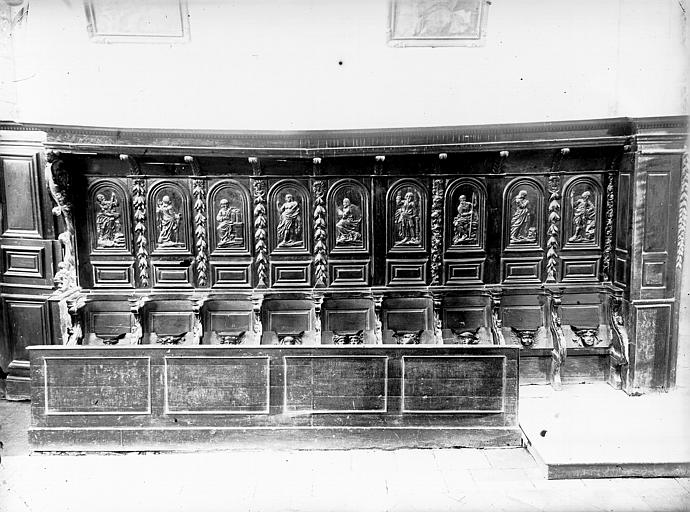 La décoration du choeur comprend cinq grands panneaux sculptés en bas-reliefs et représentant des scènes de l'ancien testament qui garnissent l'extrémité du choeur. A l'entrée à droite et à gauche, deux rangées de stalles dont les dossiers portent en bas-reliefs les images des prophètes.