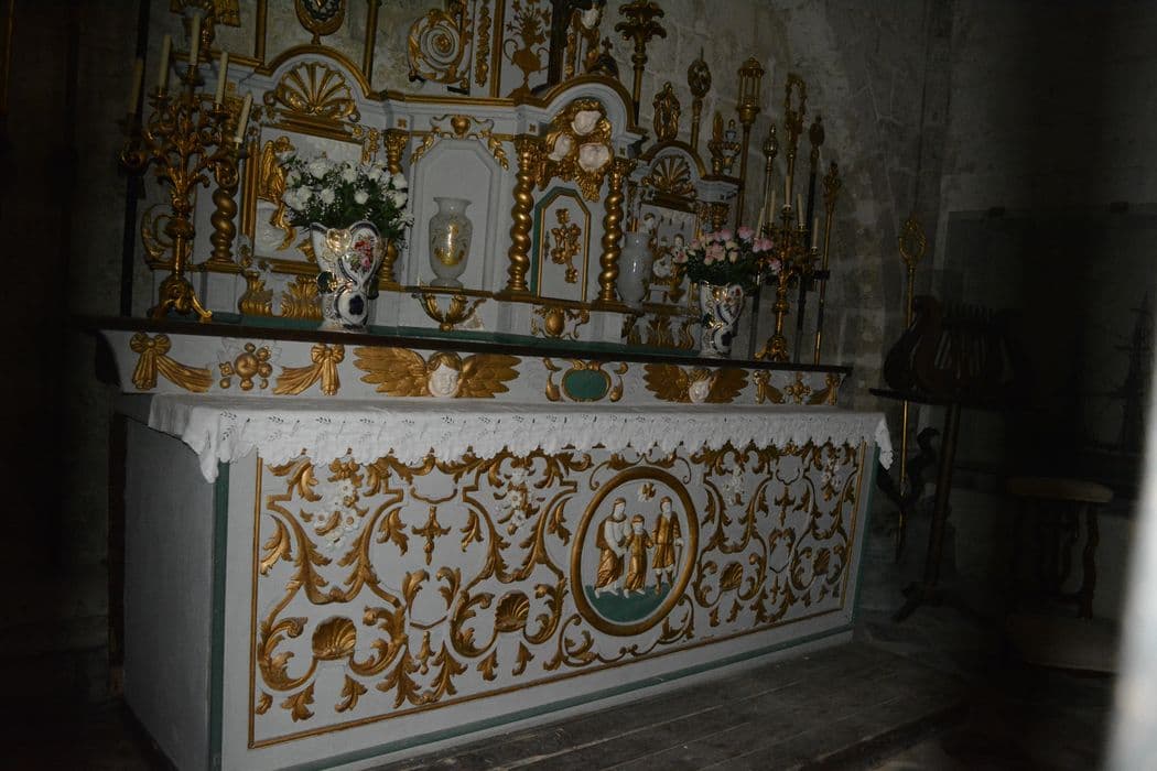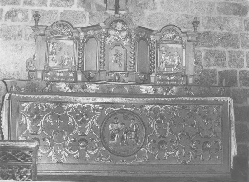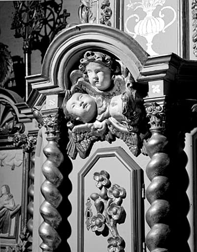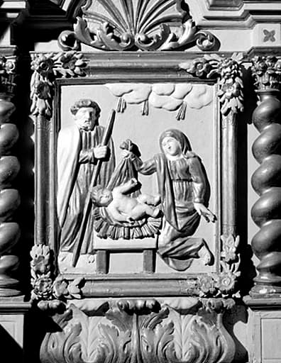 Tabernacle avec comme panneau à gauche l'Annonciation, à droite la Nativité et avec trois lots d'anges. Devant d'autel avec la Sainte-Famille.