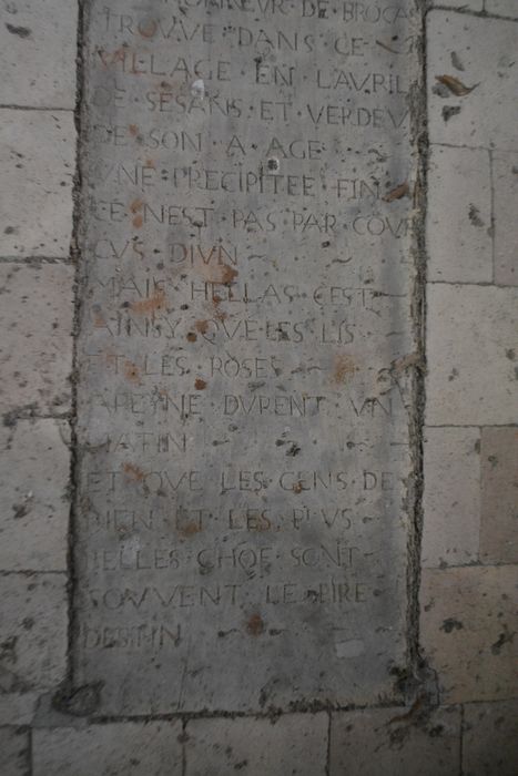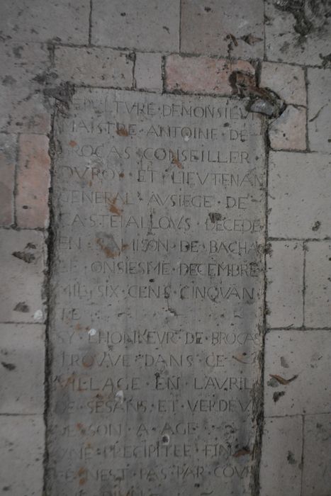 inscription : Sépulture de Monsieur Maistre Antoine de Brocas Conseiller du Roy et lieutenant général au siège de Casteiallous décédé en sa mison (sic) de Bachac le onsiesme décembre Mil six cens cinquante. Sy l'honneur de Brocas trouve dans ce village en l'avril de ses ans et verdeur de son aage une précipitée fin, ce n'est pas par courrous divin mais hellas c'est ainsy que les lits et les roses à peyne durent un matin et que les gens de bien et les plus belles choses ont souvent le pire destin. Date : 1650.