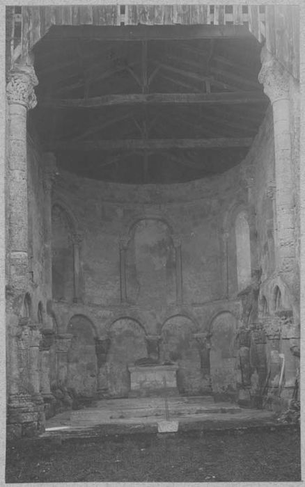 Autel adossé contre la colonne de fond de l'abside et faisant corps avec la maçonnerie. Les parements se composent de cinq assises. Il est en forme de cippe rectangulaire. Un bandeau chamfreiné au sommet, un bandeau tabulé à la base forment sa seule décoration.