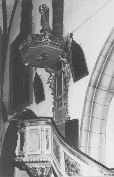 Cuve ornée de cinq panneaux de bois peints en faux-marbre. Escalier d'accès traité dans le même esprit. L'abat-voix est soutenu par deux angelots et une colombe aux ailes déployées orne la partie inférieure. La partie supérieure est surmontée d'un ange montrant le ciel.