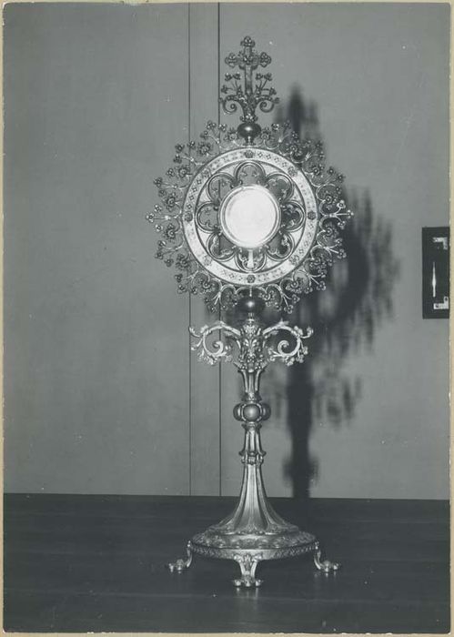 Ostensoir en bronze doré, rosace émaillée, émaux sur la couronne.