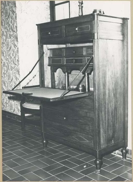 Deux petits tiroirs et trois longs, tiroirs au bas. Abattant pupitre. Six petits tiroirs à l'intérieur.