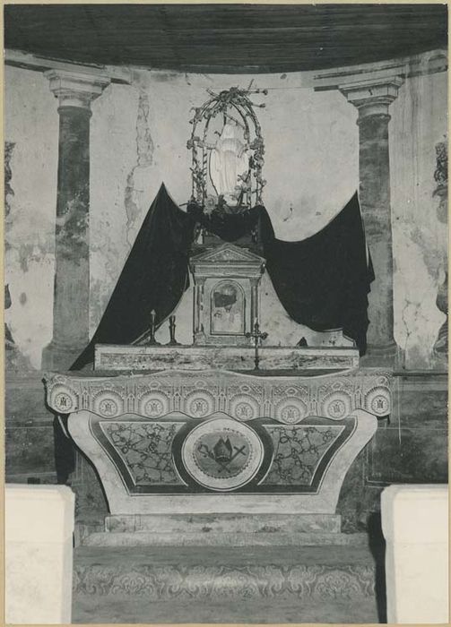 Peintures murales en trompe l'oeil (faux marbres jaune, ocre et vert), représentant des vases à fleurs, des guirlandes, des flambeaux et des colonnes. Autel tombeau orné des insignes épiscopaux.