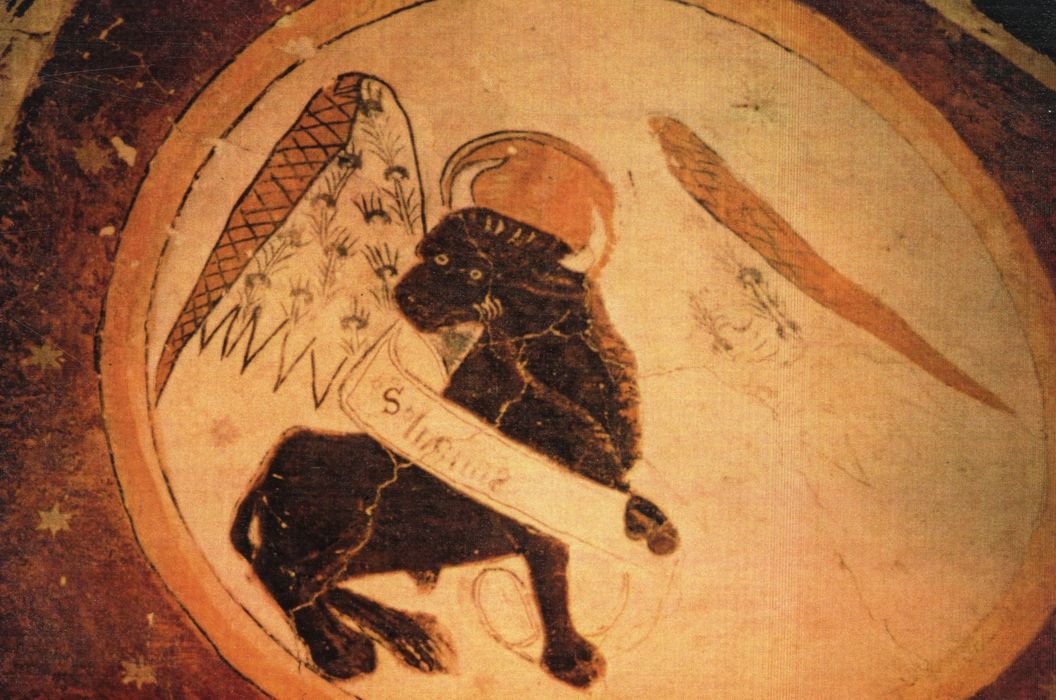Armoiries (sur le registre supérieur du mur nord) : D'azur à trois fleurs de lys d'or, couronne à 5 fleurons, tenants : 2 anges ; inscriptions (sur les phylactères des symboles des Evangélistes) : S. Marcus, S. Luchas, S. Matheus, S. Johannes.