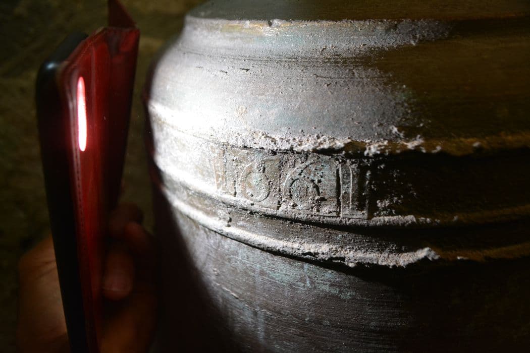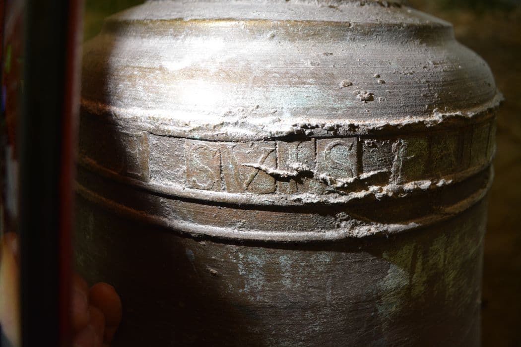 Cloche de profil gothique, fendue, portant une épigraphie dans un bandeau entre deux filets et un troisième au-dessous. Trois filets sur la jupe, deux filets sur la corde. Aucun autre décor, pas de signature, pas de battant.