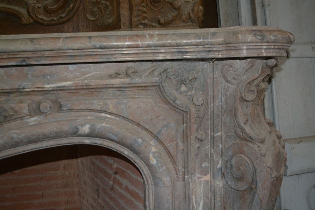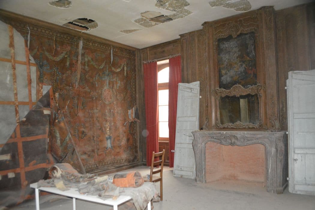 Cuirs dorés ciselés (cuirs ciselés revêtus de dorure à la feuille d’argent, recouvert de vernis jaunes obtenus à partie de résines végétales) et polychromes (peinture à l’huile) avec leurs supports de châssis en bois et leurs bandes de tension auxquels les oeuvres sont fixées. Décor de motifs floraux et végétaux, dans un encadrement de bordures pour chaque panneau (constituées d’anneaux dorés juxtaposés, parfois remplis d’un motif floral), guirlandes, feuillages, rosettes, motifs rocaille, pots à feu, vases, paniers fleuris, piédestaux, métaillons présentant différentes scènes animées de putti. Les dimensions des parties non exposées n’ont pas été prises en raison de la fragilité de l’ensemble des fragments actuellement conservés (protection IMH 2024). La partie exposée représente environ 55 mères carrés.