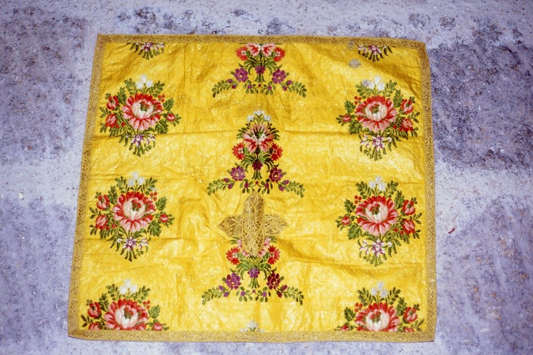 l = 54,5 ; la = 50,5 dimensions du voile de calice ; manipule : l = 92, la 24,5 ; bourse de corporal : l = 27, la = 19,5