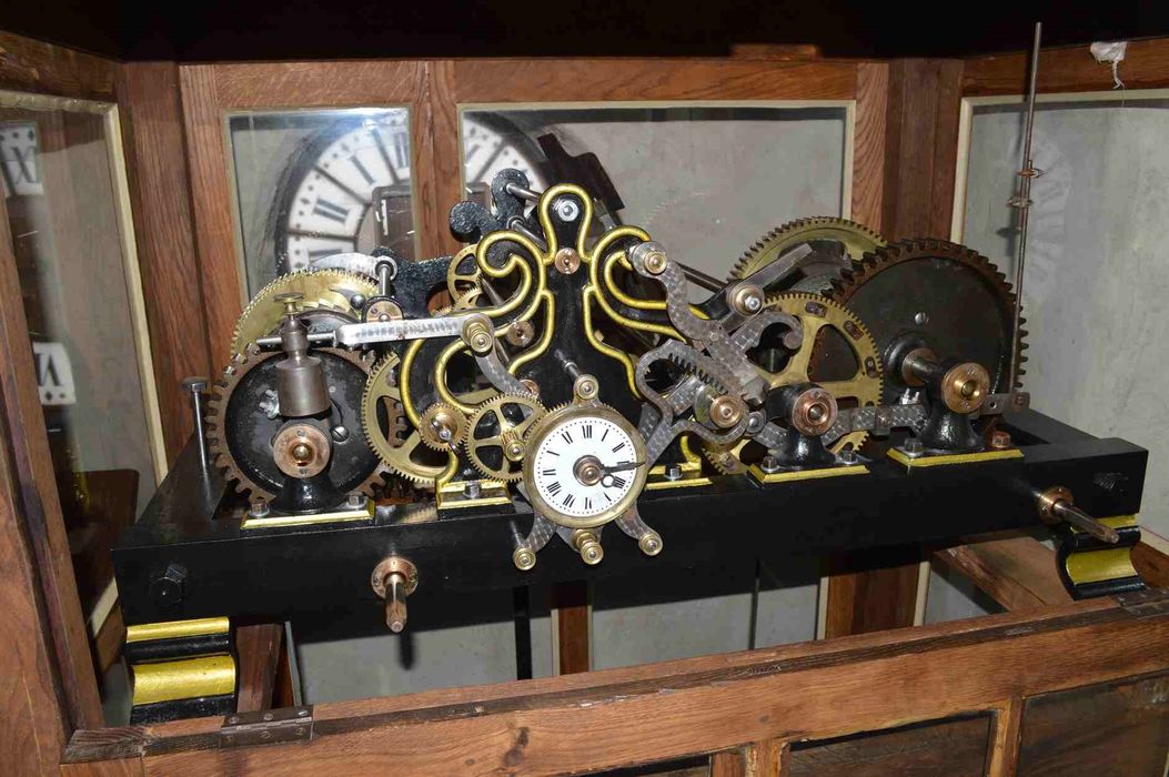 L'origine et la datation du mouvement sont indiquées au dos de la grande détente. Il s'agit d'un mouvement de Paul Odobey à Morez (Jura) daté de 1897 et conservé dans son meuble d'origine. Le mouvement a été restauré en 2013 et réinstallé dans sa tour. Il s'agit, avec le mécanisme de Chanac, de la seule horloge d'édifice toujours en fonctionnement sur le département.