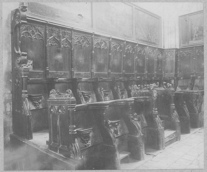 Le dossier est formé d'une arcature gothique. Les miséricordes et les accoudoirs sont ornés de feuillages, d'animaux et de têtes humaines.