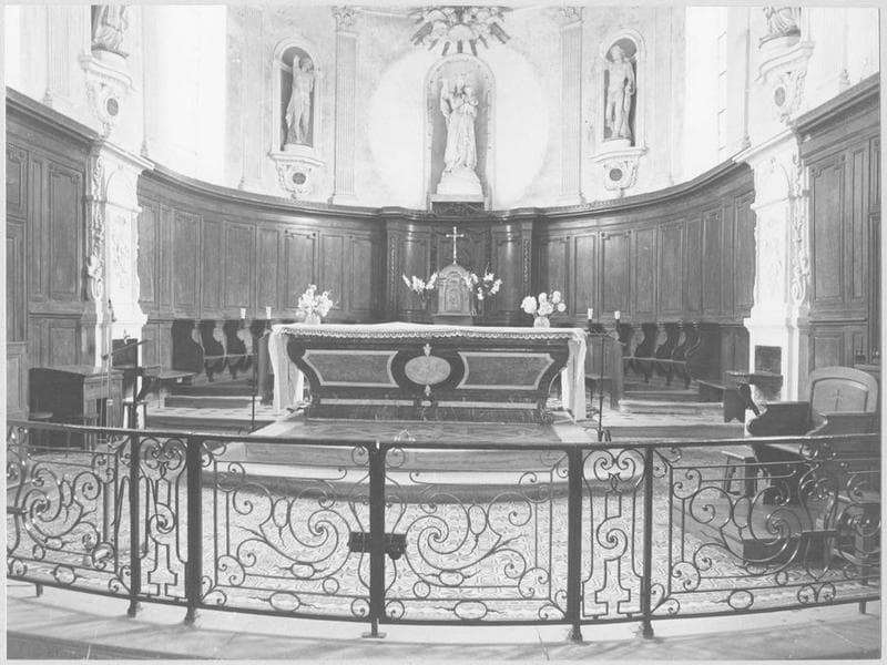 14 stalles à haut dossier et une stalle centrale. La boiserie du fond de l'abside est ornée de chute d'instruments de musique.