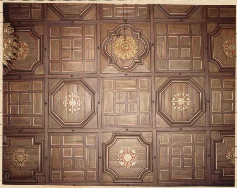 Ce plafond dissimule un lambris cloué sur une charpente encore en place. Le décor se compose de caissons carrés alternés un sur deux d'un montage de douze panneaux carrés et rectangulaires et de motifs géométriques : octogones et quadrilobes.
