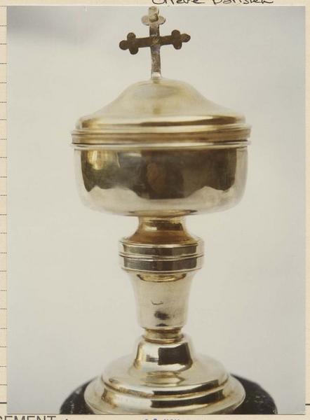 Le pied circulaire présente une moulure en talon renversé. Le noeud balustre contient les saintes huiles. La coupe est aplatie.
