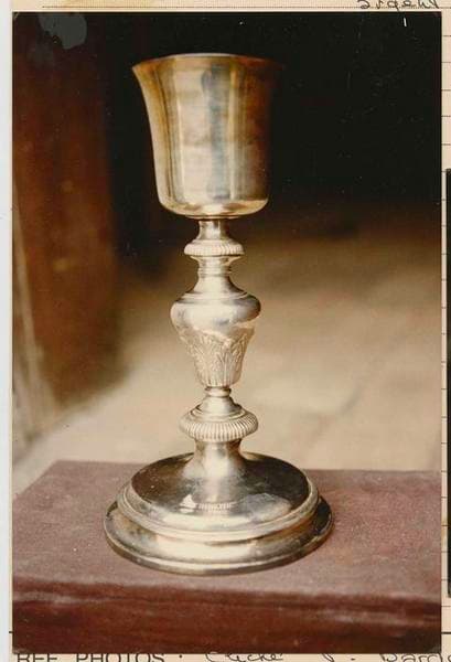 Calice en argent. Patène en argent doré. Le pied sans aucune décoration est de forme circulaire.