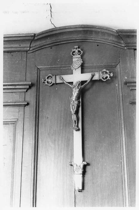 Croix en métal plein (cuivre jaune), fixée à la boiserie. La croix se termine aux extrémités par des fleurons en métal coulé et des feuilles d'acanthes au pied.