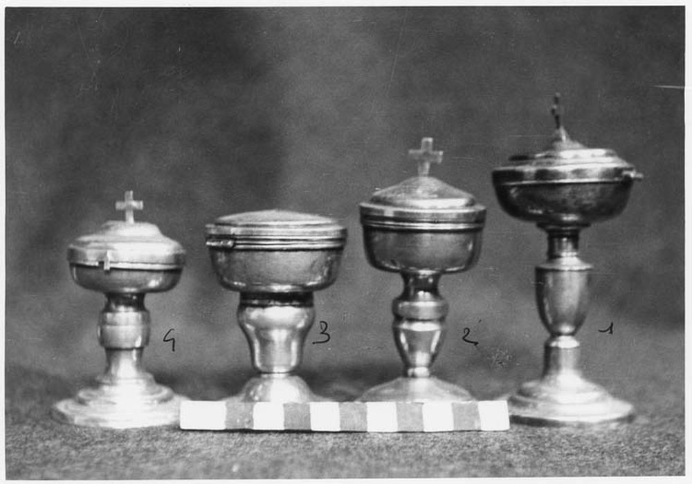 Quatre custodes pour communier les malades avec ampoules pour l'huile des malades dans le pied. Ils sont formés d'un pied circulaire, d'un noeud balustre et d'un couvercle à charnière, dont trois sont surmontés d'une croix. Le quatrième a un couvercle pourvu de deux tenons à griffes qui s'adaptent sur un listel, en tournant.