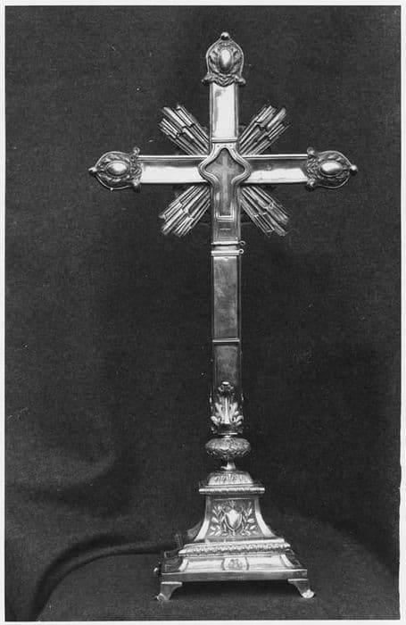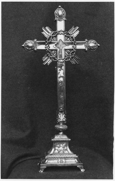 Croix-reliquaire de la Vraie Croix en argent en partie doré. Pied à base rectangulaire sur quatre pieds cornières, moulure en cavet et à entrelacs. Tronc de pyramide à arêtes concaves. Noeud aplati. Croix avec capse à vitre ouvrante pour la relique et en dessous réceptacle pour l'authentique.