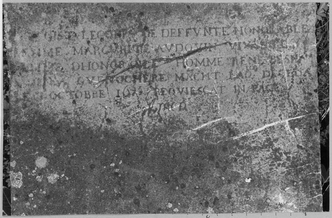 Epitaphe gravée sur l'oeuvre : CI GIST LE CORPS DE DEFFUNTE HONORABLE FEMME MARGERITE AVDOVIN VIVANTE FEMME DHONORABLE HOMME RENE BESN (...) GVENOCHERE MARCHT LAQLLE DECEDA LE 7 OCTOBRE 1675 REQVIESCAT IN PACE Amen.