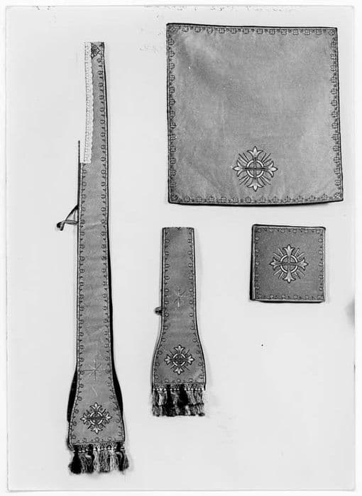 ornement liturgique catholique ; chasuble ; dalmatique (2) ; chape ; étole de clerc ; manipule ; bourse de corporal ; voile de calice ; voile huméral