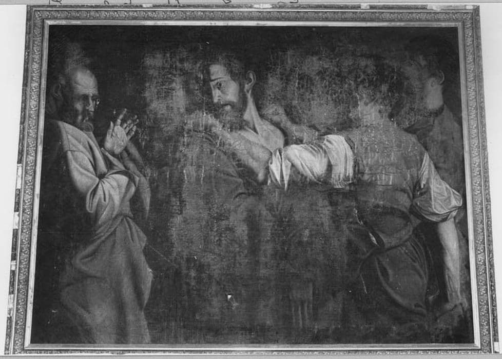 Au centre, le Christ, les mains attachées, se tourne vers saint Pierre, à gauche. A droite, deux hommes tirent le Christ vers l'avant.