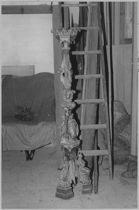 Le pied est formé de trois patins sur lesquels reposent trois anges et d'où part la tige à six pans ornée de statues et de chapiteaux. La tige se termine par une coupe à bord de feuilles.