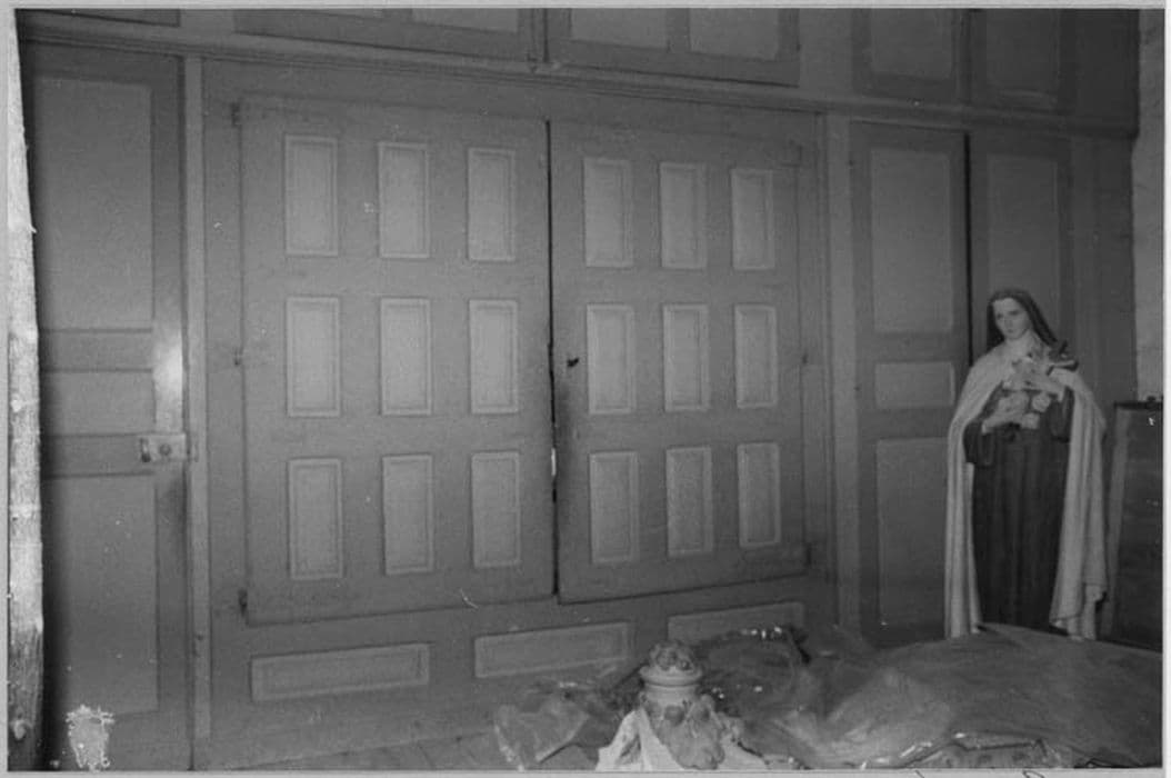 Armoire à deux portes formées de neuf petits panneaux rectangulaires, inclue dans les boiseries de la sacristie, mais indépendante. Ferrures en forme de fleur de lys.