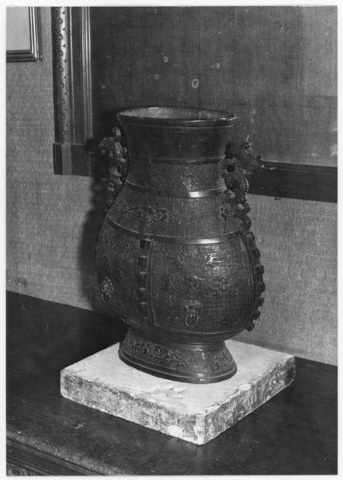 Piédouche en forme de tronc aplati, panse aplatie se rétrécissant vers le col, avec bandes verticales à redents sur les deux tiers et bandes horizontales sur le premier tiers. Vase doté de deux anses ajourées. Cartouche en étain gratté. Patine foncée.