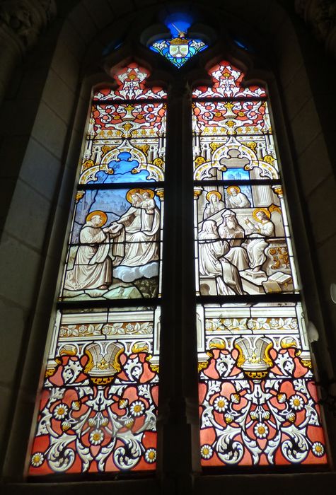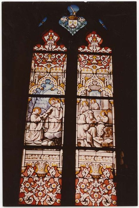 Vingt-quatre panneaux composent deux scènes sur chacune des deux lancettes de la fenêtre.